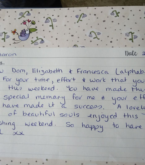"Francesca, Elizabeth and Dom, what a wonderful experience I have had this weekend. Thank you for being the gorgeous people you are. I know because of this weekend I have started a new spiritual journey in life! Love to you all. x Fiona"